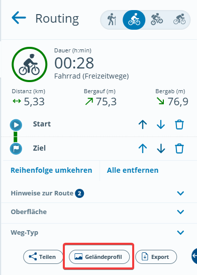 Wenn beim Routing die Reihenfolge der Punkte umgedreht wird, kann es bei den Angaben zu Bergauf und Bergab aus technischen Gründen zu leichten Abweichungen kommen.